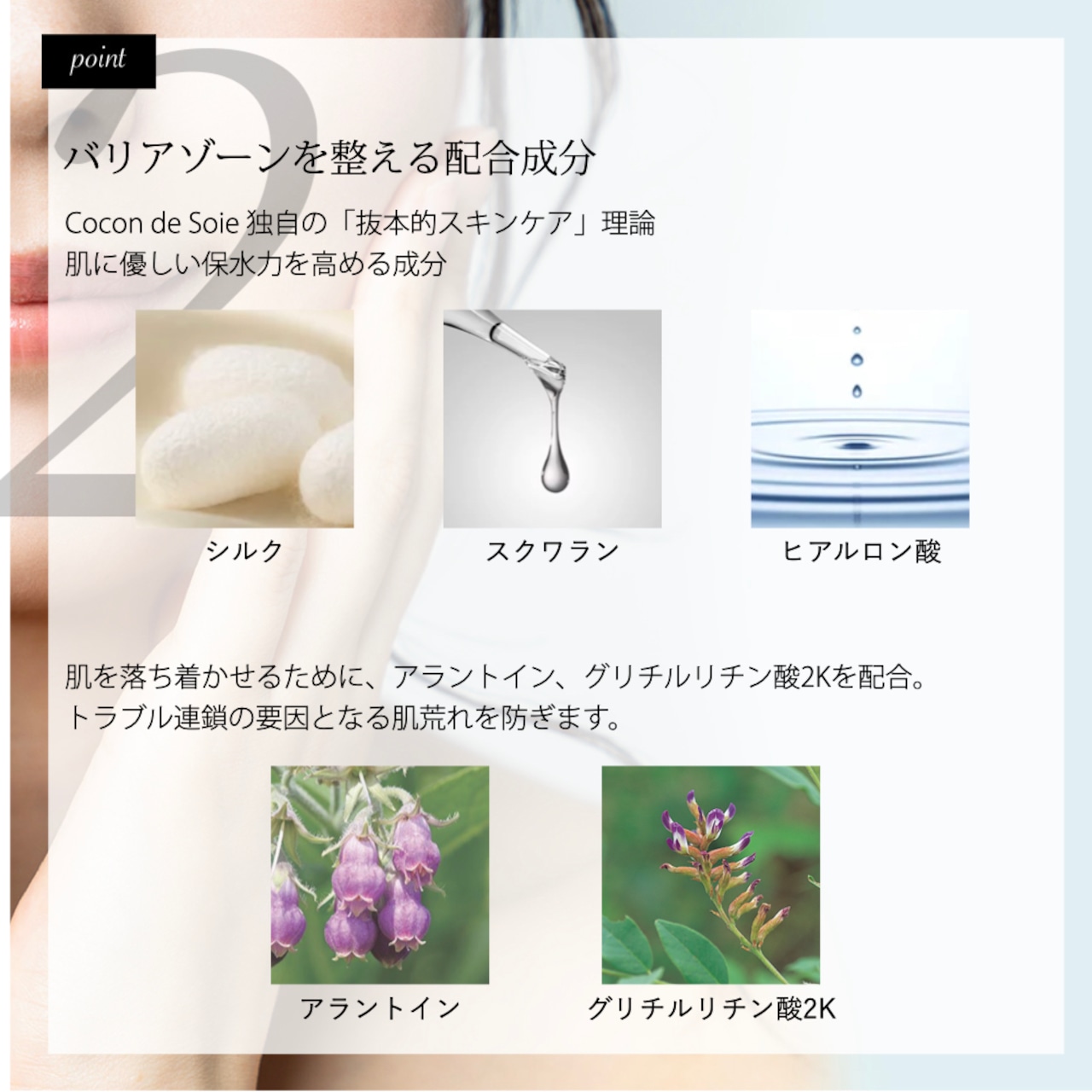 全成分:水、BG、グリセリン、オリーブ果実油、グリチルリチン酸2K、加水分解シルク、アラントイン、糖脂質、ユズ果実エキス、ヒアルロン酸Na、加水分解ヒアルロン酸、水溶性コラーゲン、クレマティス葉エキス、スギナエキス、ヒバマタエキス、セイヨウキズタ葉/茎エキス、セイヨウナツユキソウ花エキス、トウキンセンカ花エキス、ローマカミツレ花エキス、フユボダイジュ花エキス、ヤグルマギク花エキス、カミツレ花エキス、セイヨウオトギリソウ花/葉/茎エキス、スクワラン、マカデミア種子油、ホホバ種子油、カニナバラ果実油、PG、(アクリレーツ/アクリル酸アルキル(C10-30))クロスポリマー、カルボマー、ラウリン酸ポリグリセリル-10、水添レシチン、水添ナタネ油アルコール、エチルヘキシルグリセリン、カプリル酸グリセリル、水酸化K、クエン酸、クエン酸Na、フェノキシエタノール